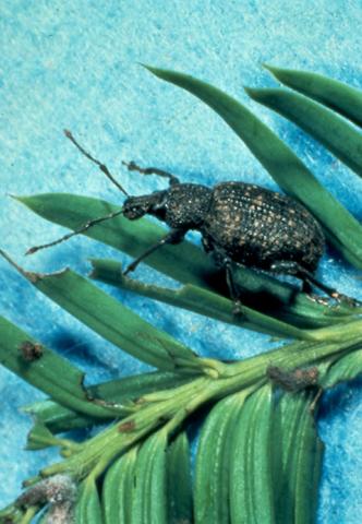 Larvae feed on feeder roots of plants. Large numbers can eat enough roots to cause the plants to decline and even die. However, in most cases the plant is able to grow new feeder roots faster than the black vine weevils eat them. In nurseries, this insect can cause severe dieback and plant death, particularly in containarized stock. The feeding damage appears as notches along the edge of the leaves. (On yews, the black vine weevil adults not only notch the needles, but sometimes eat the tip end of the needle off.)