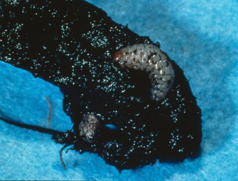 The adult weevil is black with gold flecks scattered on its fused wings.