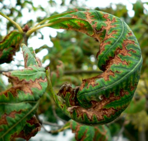 Most woody plant foliage become limp, curl, wilt, go off color, plant cells furthest from the veins can turn brown and die (scorching) or any combination of these symptoms at first. The entire leaf may eventually die. In prolong severe droughts, the entire plant may die.