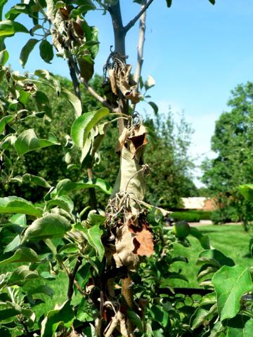 Over-stimulated rosaceous plants (due to heavy pruning and/or high nitrogen rates) are at high risk for fire blight infections. In an infected planting, and while trees are dormant, remove all cankered wood, pruning 6 to 12inches below the last visible sign of the canker (avoid leaving a stump, remove the affected branch all the way to the trunk or nearest side branch that is at least 6 inches below the canker). Canker removal will eliminate a large part of the primary inoculum for the following year. Pruners do not need to be disinfected between cuts unless pruning is done during the growing season. If pruning is done during the growing season, 6-12 inches of healthy tissue should be removed along with the cankered areas. All prunig during the growing season must be carried out in hot & dry conditions.