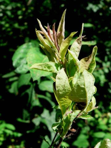 Honeysuckle aphid became a problem in Illinois in the early 80's in the Chicago area. It has since spread throughout Illinois. It feeds on most honeysuckles. However, Lonicera tatarica 'Arnold Red" and small shrub varieties are resistant to the insects feeding and do not show damage.