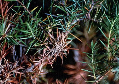 Juniper webworm attacks horizontalis, depressa, aurea and most of the Chinese junipers.