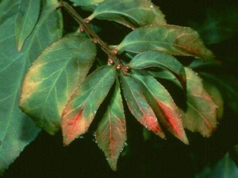 Commonly found on red maple (Acer rubrum), wafer ash (Ptelea trifoliata), and burning bush (Euonymous alatus).